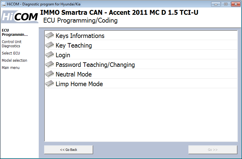 Algunos vehículos tienen una llave inteligente sin contacto (RFID) en lugar de una llave mecánica. En estos vehículos, la codificación a través de la operación SMARTRA fallará; es necesario utilizar una unidad de control de llave inteligente dedicada especial para este propósito. La función se puede encontrar en la unidad de control de ahorro de código de llave inteligente (PIC, SMKCODE).