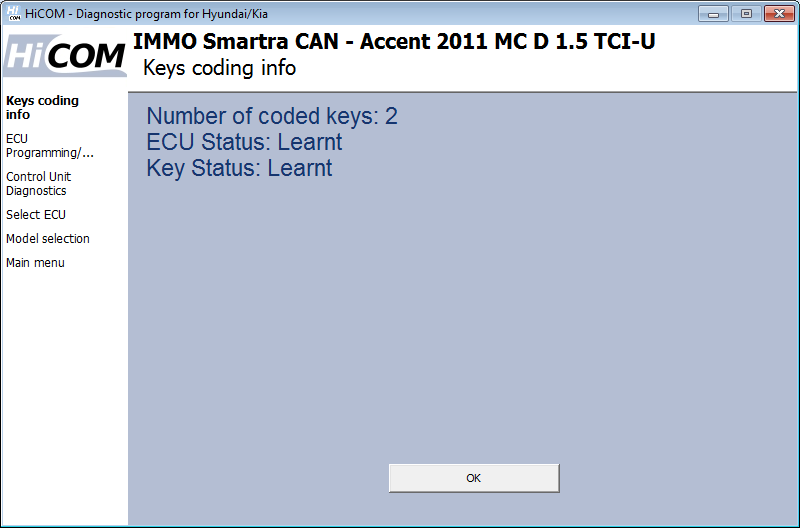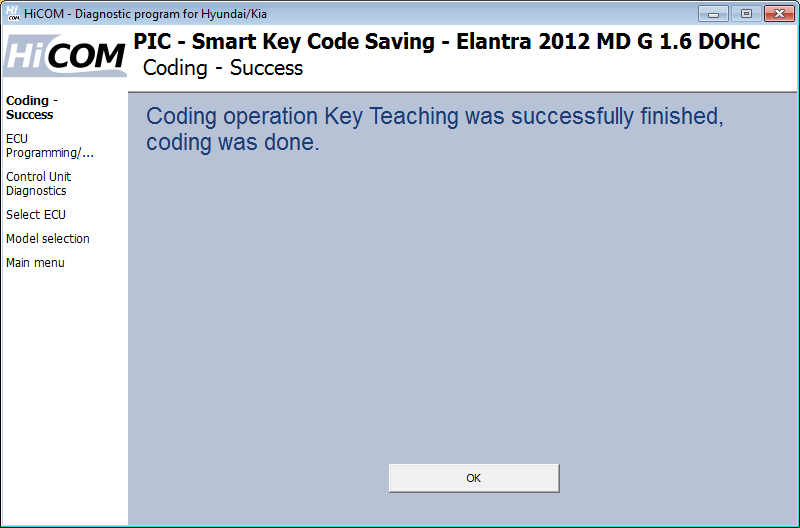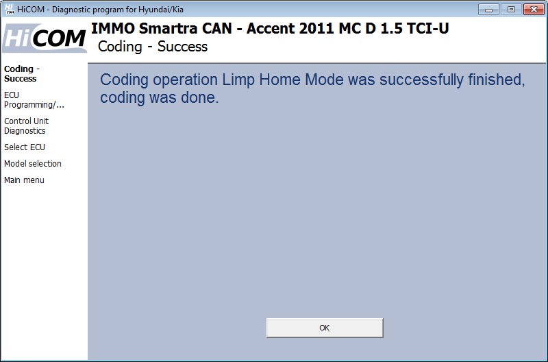 Una vez completada la operación de codificación, HiCOM muestra información sobre la codificación exitosa.