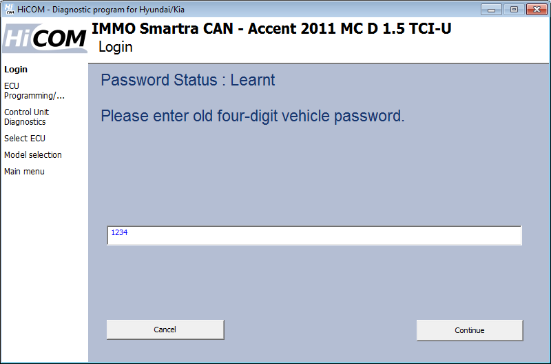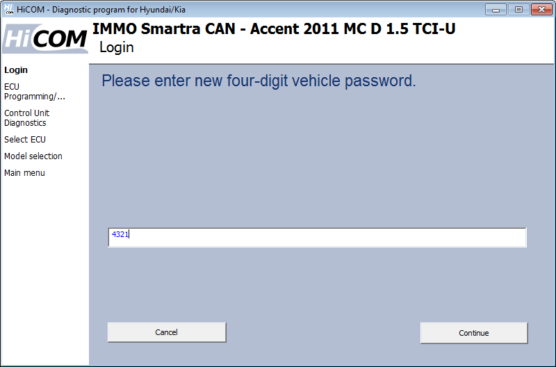 Se le pedirá que ingrese la contraseña, si la unidad de control no es "Virgin". La contraseña es numérica y consta de 4 dígitos decimales (por ejemplo, 1234). En cuanto a la unidad de control Virgin, se le solicita directamente que establezca una contraseña.